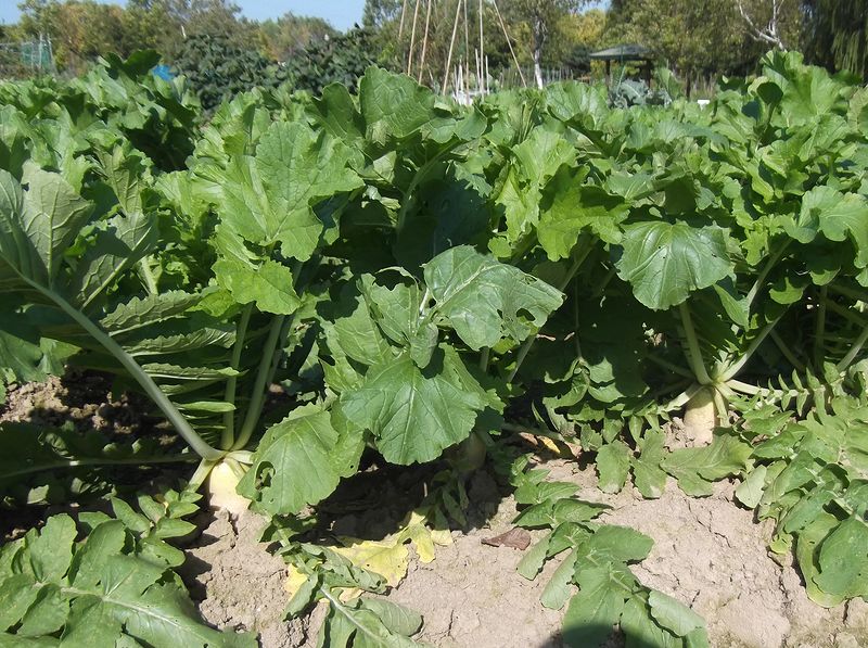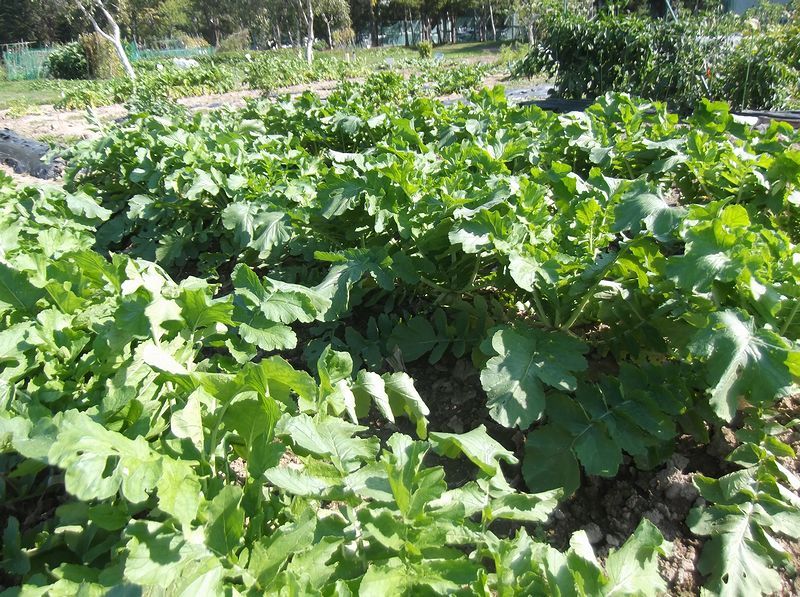 ダイコン種蒔き後45日目。少し飛び出しているダイコンが何本か見受けられるが,前年同時期と比較すると若干生育が遅いか。 写真をクリック |