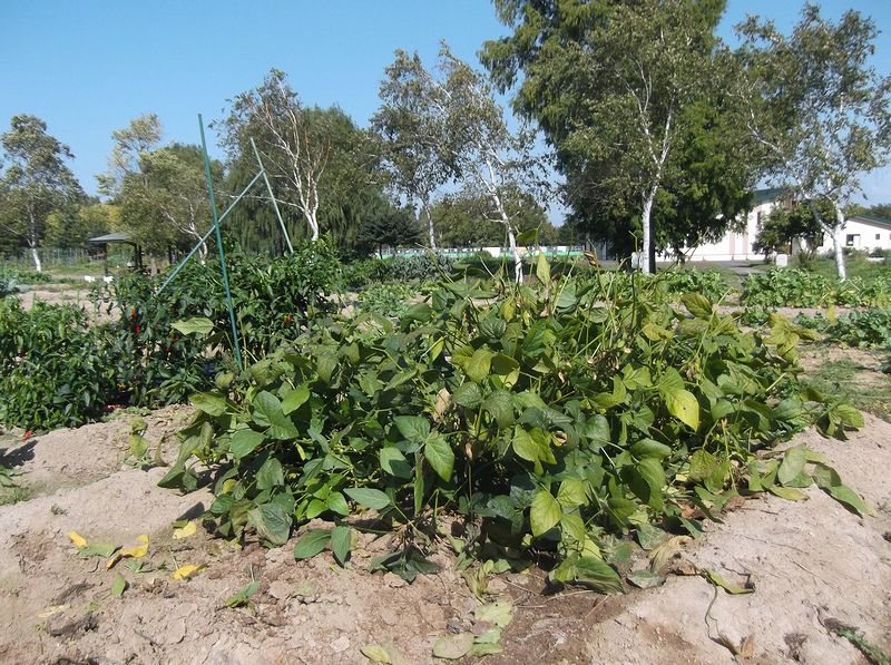 すでに枯れ気味のおしまみどり(エダマメ)。生育が遅すぎるのと,しかも鞘の豆が充分に膨らまなかったので翌年以降はやめようと思う。 |