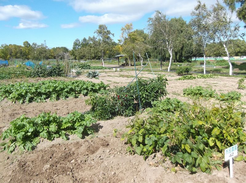 奥からダイコン3列,ピーマン軍団(手前からシシトウ,ナンバン,ピーマン),ダイコン,エダマメと写真に写っていないが一番手前にダイコン。収穫の終わった畝を崩して平らにした。 |